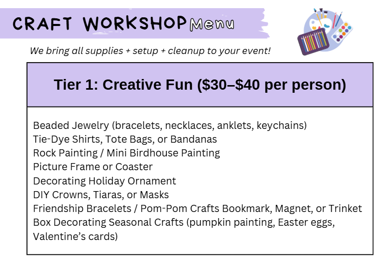 Craft Workshops Now offering balloon & decor services in Northern Virginia, DC & Maryland! Now offering balloon & decor services in Northern Virginia, DC & Maryland! Now offering balloon & decor services in Northern Virginia, DC & Maryland!